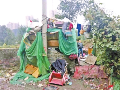 他們從花園路劉莊到鄭上路,走了近2個(gè)小時(shí)。走到鄭上路須水河西岸時(shí),發(fā)現(xiàn)在一塊荒蕪的墳地中,有一窩棚,隱約看到有身影在走動。近前看到,一位瘦黑的老人站在雨里,正在一簡陋土灶上煮面條。老人身上的衣服已淋濕,陪老人的是一條流浪狗,狗是老人撿的。窩棚很小,僅能容下一人,蜷縮著才能躺下。由于窩棚漏雨,鋪蓋內(nèi)也是濕的。