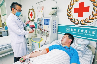 “上午8點(diǎn)半開始采集,3個(gè)小時(shí)順利結(jié)束?!弊蛱焐衔纾瑏碜越棺髑哧柕?3歲退伍兵張國強(qiáng),在河南省腫瘤醫(yī)院造血干細(xì)胞采集室成功捐獻(xiàn)造血干細(xì)胞混懸液194毫升。